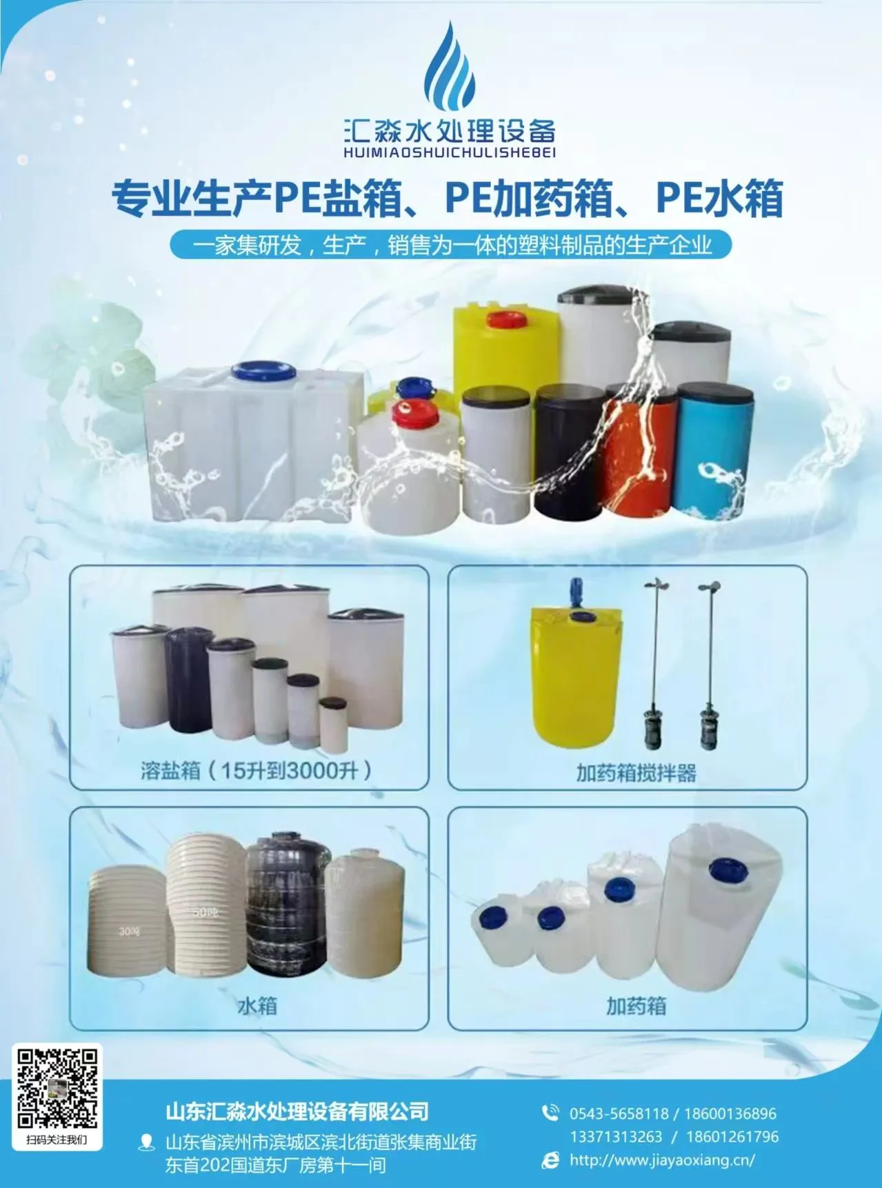 山东汇淼水处理设备有限公司(以下简称汇淼)是一家集研发,生产销售为一体的塑料制品的生产企业。生产基地位于山东省滨州市,地理位置优越,交通便利! 汇淼专业生产PE盐箱,PE加药箱,PE水箱;产品规格从15L到20000L不等,汇淼所有产品均取用优质食品级聚乙烯PE原料及配方用料采用国外成熟的整体一次性完整成型技术,具有造型美观,内外光滑,无焊无缝,无毒无味,耐酸,耐碱,耐碰撞,耐冲击,耐高温,耐冷冻,不渗漏,不易老化,无需维修及清洗,安装,运输,安全,便捷等优势。