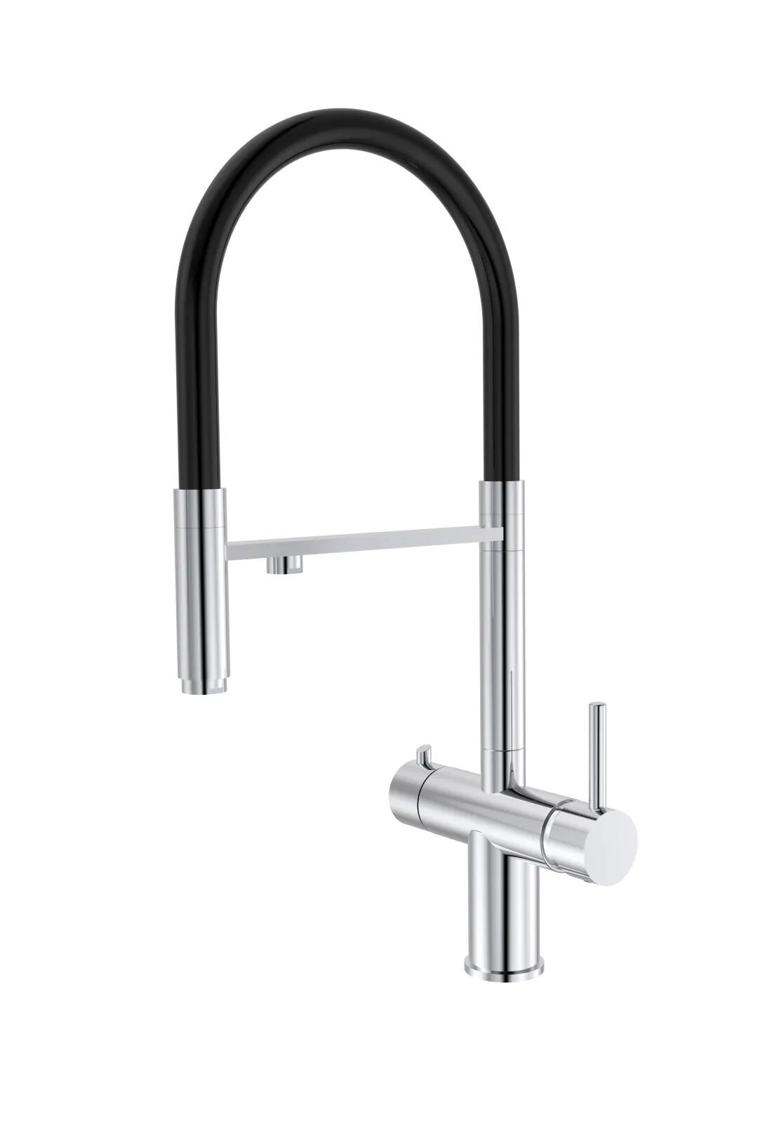 三合一水龙头,可连接开水机使用。食品级双层硅胶软管,出水头可随意活动。开水手轮具备自动回弹与自锁功能,有效防止误触,降低烫伤风险。
