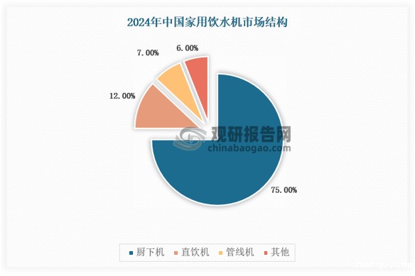 总体来看,我国家用净水器行业主要产品以厨下机、直饮机、管线机等,按销量分布,厨下机是我国主要的家用净水器细分市场,其市场份额达到75%,其次是直饮机,市场份额为12%,管线机为6%。具体如下: