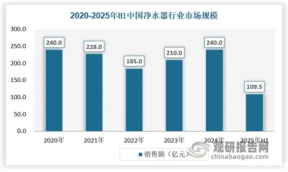 近年来中国家用净水器市场经历阶段性波动后,整体保持稳健增长。2020年-2022年这三年受疫情影响和房地产下行导致下游减少等因素,导致销售额下滑;2023年逐步恢复疫情前市场,24年在国补拉动下行业销售额加速增长。2025年上半年我国净水器销售额达到109.5亿元,同比增长22%。具体如下: