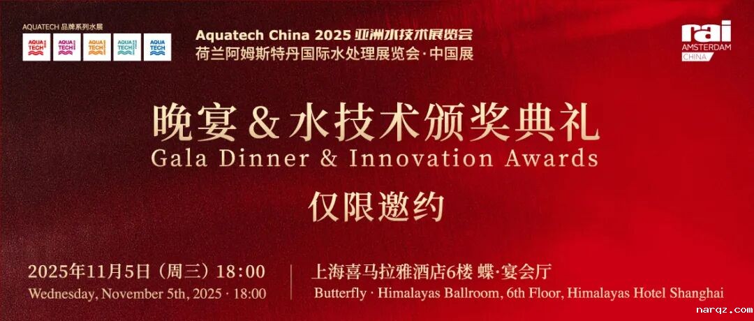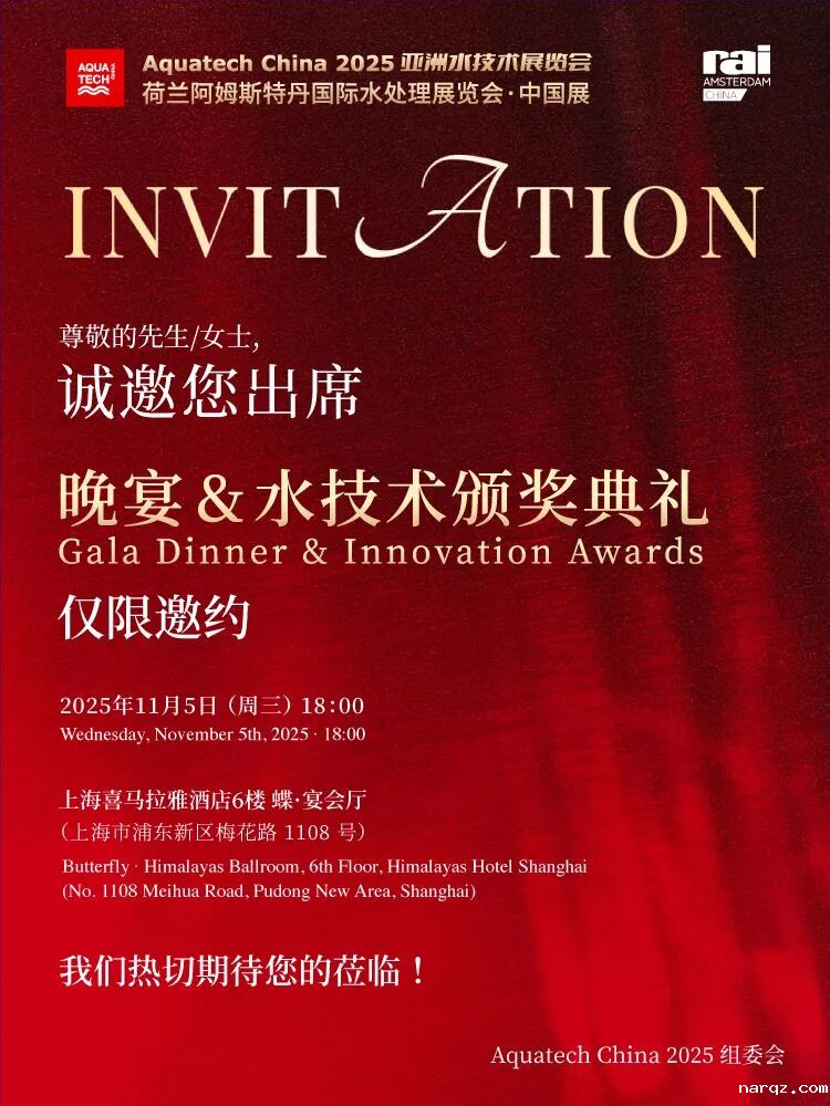 2025年,机遇与挑战并存,“创新”、“转变”、“合作”、“共赢”正成为行业发展的主旋律。Aquatech组委会诚意为行业同仁打造面对面交流的平台,凝聚行业力量,以真诚促相聚,携手共期未来。晚宴现场,我们还将隆重颁发一年一度的 Aquatech China 水技术创新奖,所有获奖项目的主创团队将受邀出席 narqz 2025 水技术创新奖颁奖典礼。