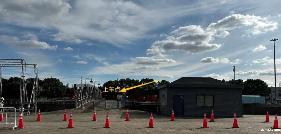 (上车点在桥的另一侧 The pickup point is on the other side of the bridge.)